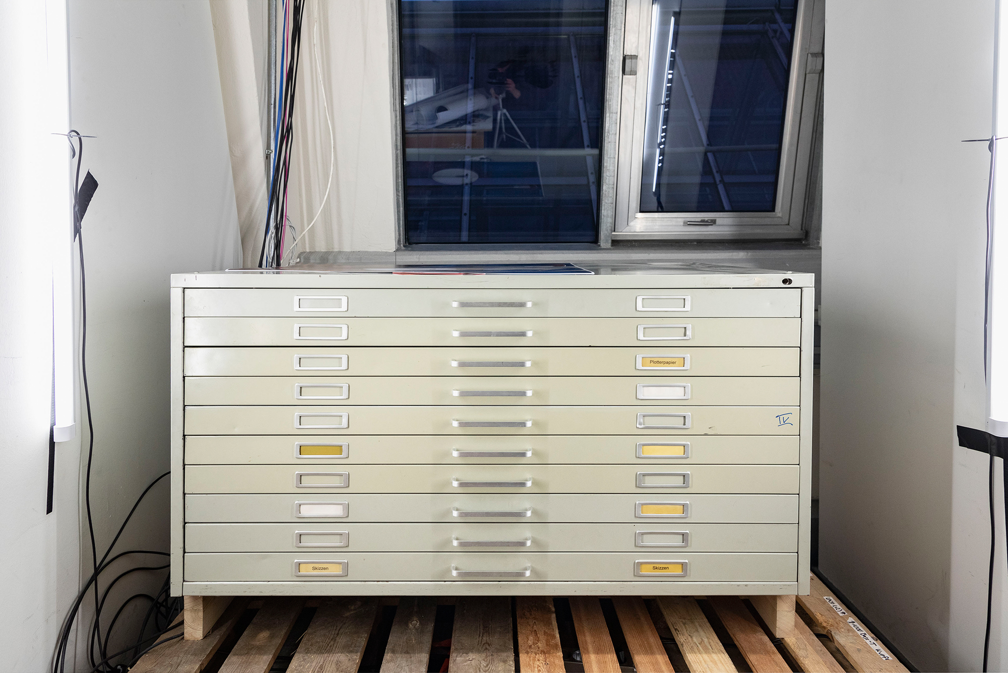 A classic analogue archival cabinet on the one hand and the digital translation of this cabinet into the world wide web: anAtlas. The level cabinet is used by Breitkopf to rearrange his archive of photography, poetry and cinematography into new narratives in real time, but always with spatial limitations to said rearrangements, the mere drawer dimensions (or tables, or walls). Pictures of the cabinet-drawers, are continuously uploaded and published on anAtlas.org. In this process the different states of Breitkopf’s art become comprehensible, making it a powerful visualization and structuring tool for creative work per se. anAtlas does not follow the ideology of an individual creative-intuitive User Interface, which draws from chaotic-magical User Experience: the visitor finds a detailed high-resolution insight into the arrangements of Breitkopf. anAtlas is not focusing on established categories of art, it is a project of research of art processes of structuring and invention. The liberation of artworks liberates the author from the captivating compositional work at best, but always objectively unmasks the structuring processes that guide said compositional work.